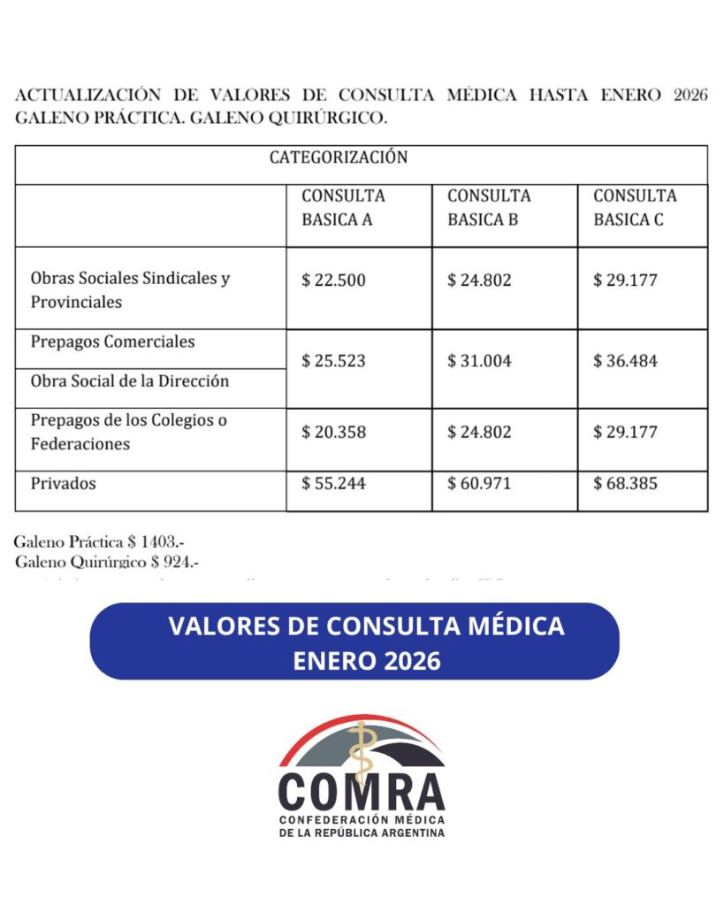 Valores de Consulta Médica – Enero 2026 Posted on 10 febrero, 2026 (10 febrero, 2026) by Confederación Médica A continuación, los valores de consulta médica, que se actualizan mes a mes en base al índice IPC.