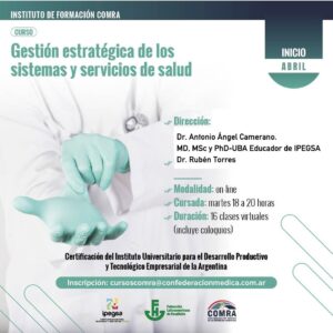 El Instituto de Formación COMRA junto al Instituto de Política, Economía y Gestión en Salud (IPEGSA) puso en marcha una serie de cursos y diplomaturas de capacitación y gestión en distintas áreas de salud con modalidad virtual (en la mayoría de los casos).